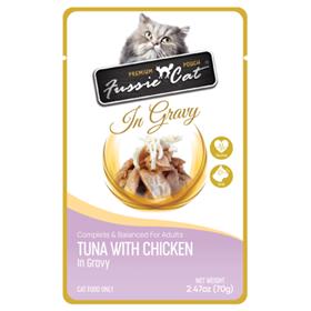Bring crave-worthy flavor to your kitty’s bowl with Fussie Cat Premium Tuna with Chicken in Gravy Wet Cat Food. Packaged in a convenient, easy-to-open pouch, this tasty recipe contains tender morsels of tuna with chicken in a savory gravy. High in moisture to boost your feline friend's daily hydration, these paw-lickin’ good meals make up a complete and balanced diet for adult cats. The recipe is rich in healthy omega-3s, which can have anti-inflammatory benefits—ideal for cats suffering from allergies, dry skin, or hotspots. It also contains the omega-3 fatty acid DHA, which can help sustain brain and vision development. Delicious and nutritious, these pouches provide an easy way to bring excitement back to feeding time!